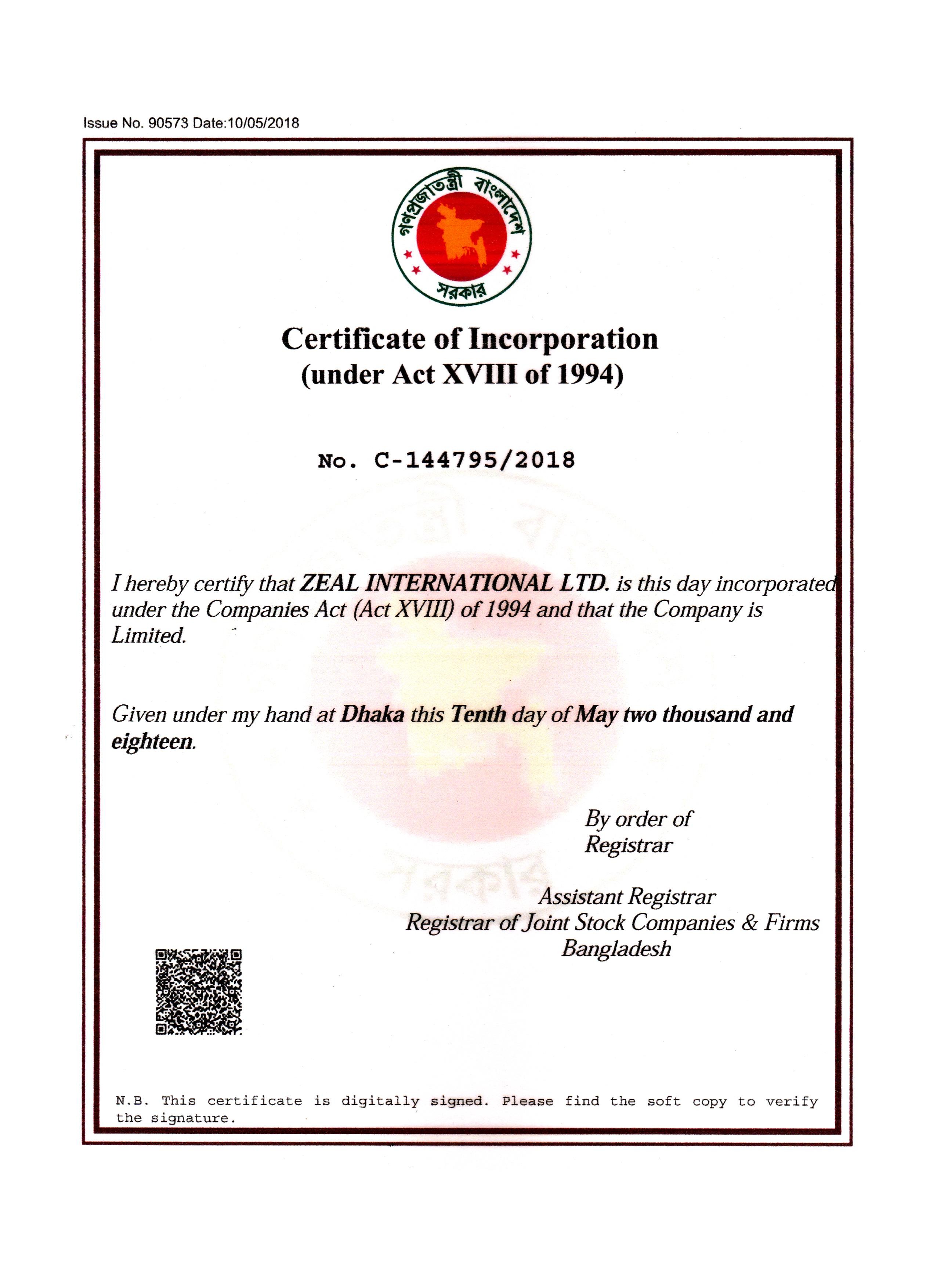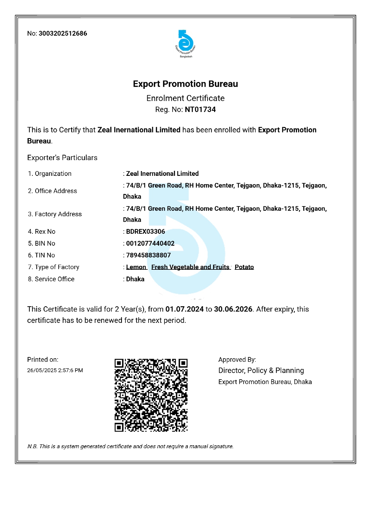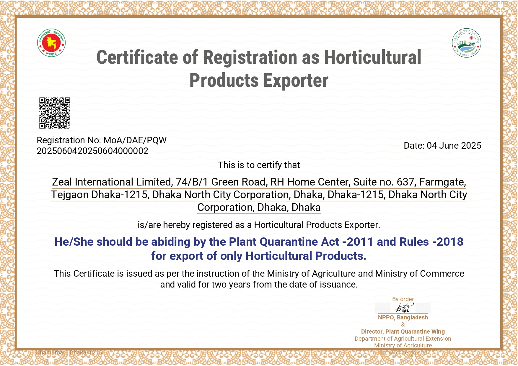 We are an officially accredited company for exporting and importing agro products by a Bangladesh government owned institution operated under the agricultural ministry. We are also an authorized limited company under Bangladesh company law that entitles all of our trade operations abroad to be completely legal and secure. Zeal international Limited is a proud member of the following authorized legal associations such as Bangladesh fruits vegetable & Allied products exporters’ association, Export Promotion Bureau, Bangladesh Cloth Merchants Association and Dhaka Chamber of Commerce & Industry. We are cordially grateful to all our stakeholders and human resources working with utmost dedication and support that make this journey become a successful endeavor.