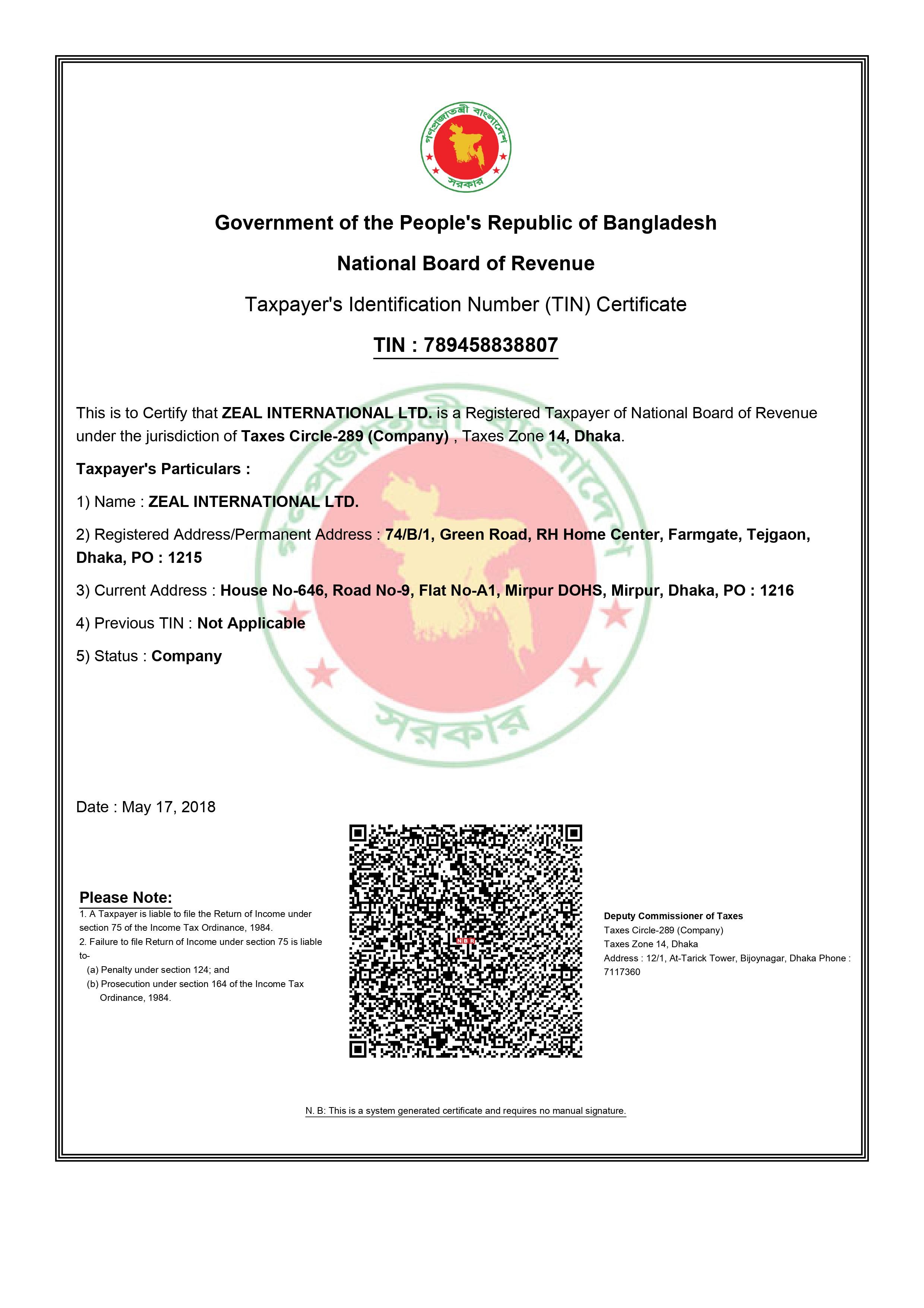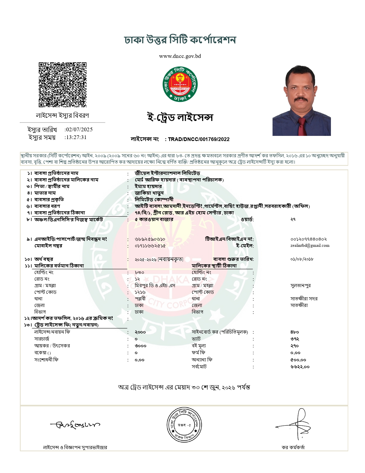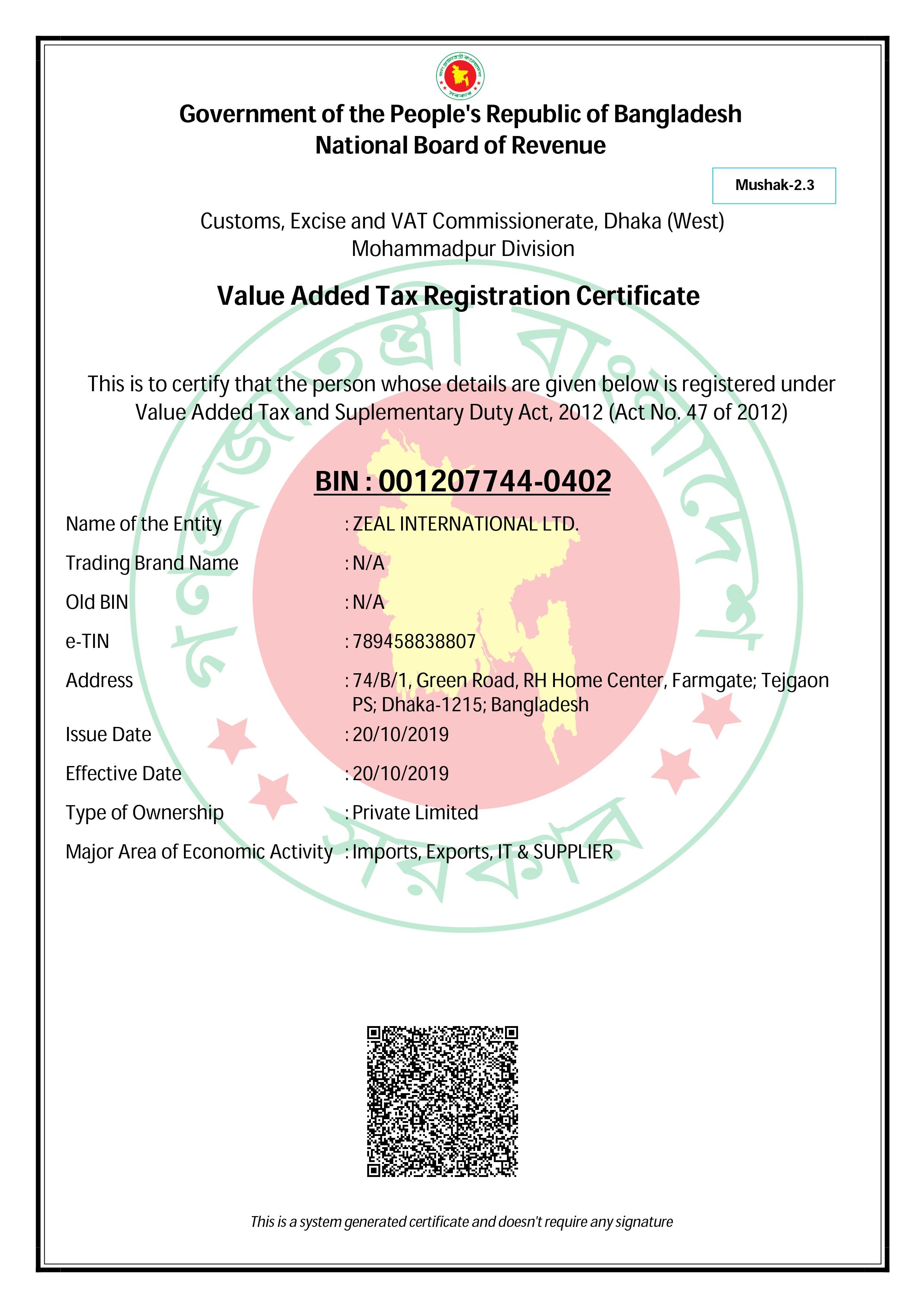 We are an officially accredited company for exporting and importing agro products by a Bangladesh government owned institution operated under the agricultural ministry. We are also an authorized limited company under Bangladesh company law that entitles all of our trade operations abroad to be completely legal and secure. Zeal international Limited is a proud member of the following authorized legal associations such as Bangladesh fruits vegetable & Allied products exporters’ association, Export Promotion Bureau, Bangladesh Cloth Merchants Association and Dhaka Chamber of Commerce & Industry. We are cordially grateful to all our stakeholders and human resources working with utmost dedication and support that make this journey become a successful endeavor.
